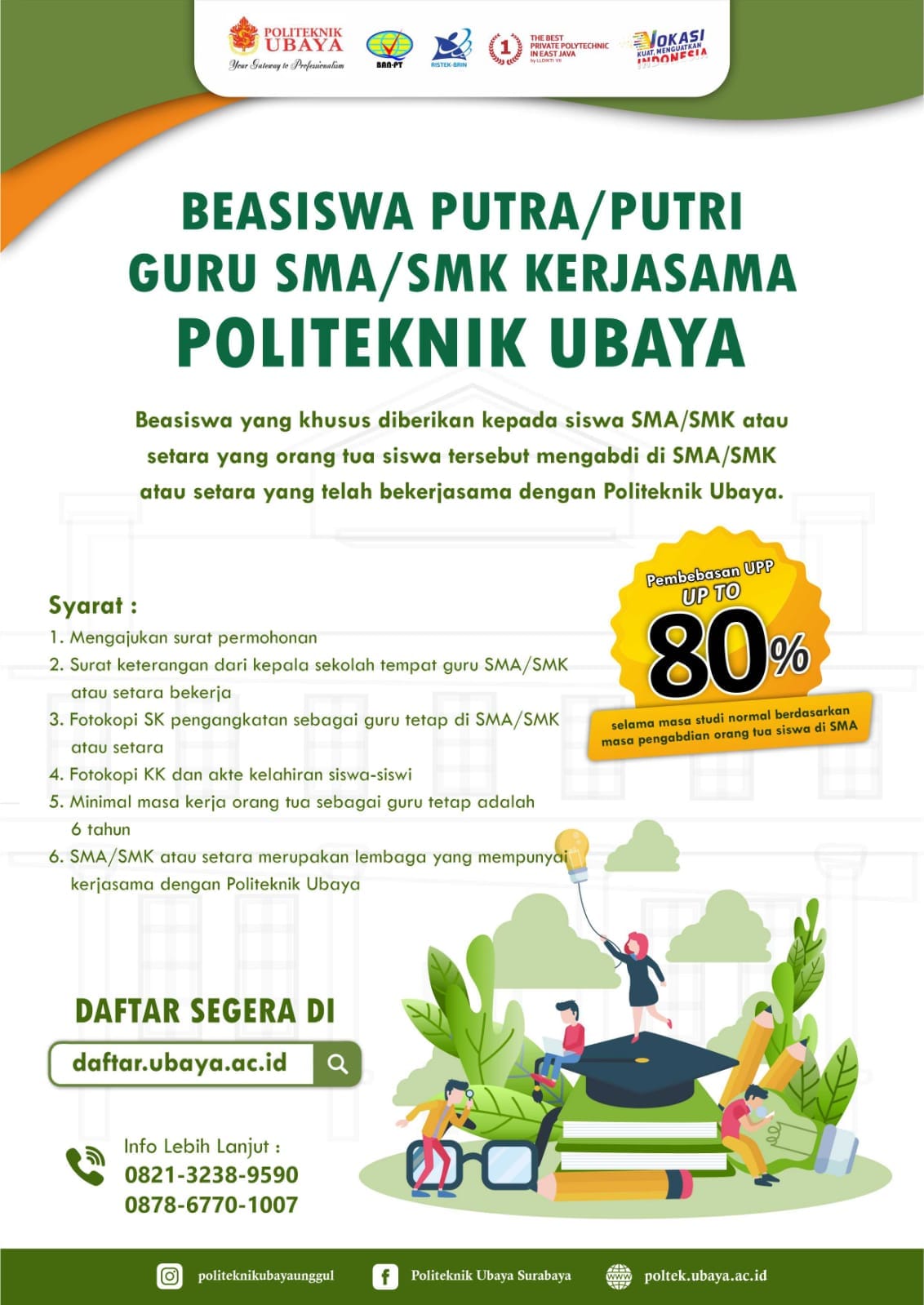 Kami *Politeknik UBAYA* sebagai perguruan tinggi vokasional yang meraih penghargaan Anugrah Kampus Unggulan (AKU) sebagai *Politeknik Swasta Terbaik di Jawa Timur sejak tahun 2015 – 2021* versi Kementrian Dikti (LLDIKTI Wilayah VII). menawarkan BERBAGAI MACAM BEASISWA AKADEMIK DAN NON AKADEMIK.